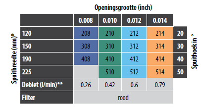 | Bijzonderheden | 55% minder spuitnevel t.o.v. normale TradeTip 3 | Standaard, meest uitgebreide spuittipserie | 55% minder spuitnevel t.o.v. normale TradeTip 3 | Fijn spuitbeeld, geschikt voor dunvloeibare producten | Dubbele spuittipopening: extra veel materiaal p/min verspuiten |