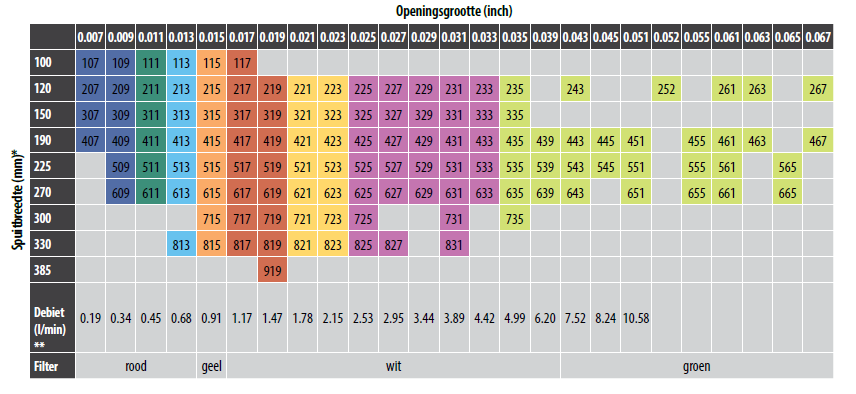 - De 9 staat voor de spuithoek. Een hoger getal = een grotere spuithoek, dus je spuit een groter oppervlak.